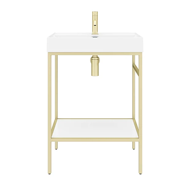 Arezzo 605 Brushed Brass Framed Washstand with Gloss White Open Shelf and Polymarble Basin