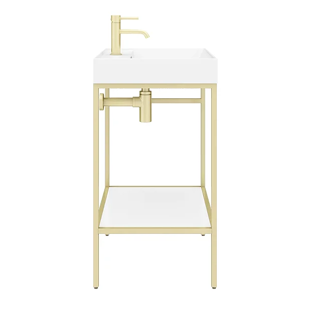 Create a hotel worthy bathroom with the Arezzo Framed Washstand. This freestanding unit brings minimalist luxury to your space, with its striking brushed brass lines and cool, gloss white components. The luxury brushed brass framed washstand has an open shelf for storing and displaying your favourite cosmetics, as well as a convenient integrated towel rail. Its durable polymarble basin includes one tap hole and a thin, modern rim. Why not pair your Arezzo washstand with a coordinating Arezzo Round Brushed Brass Mixer Tap?