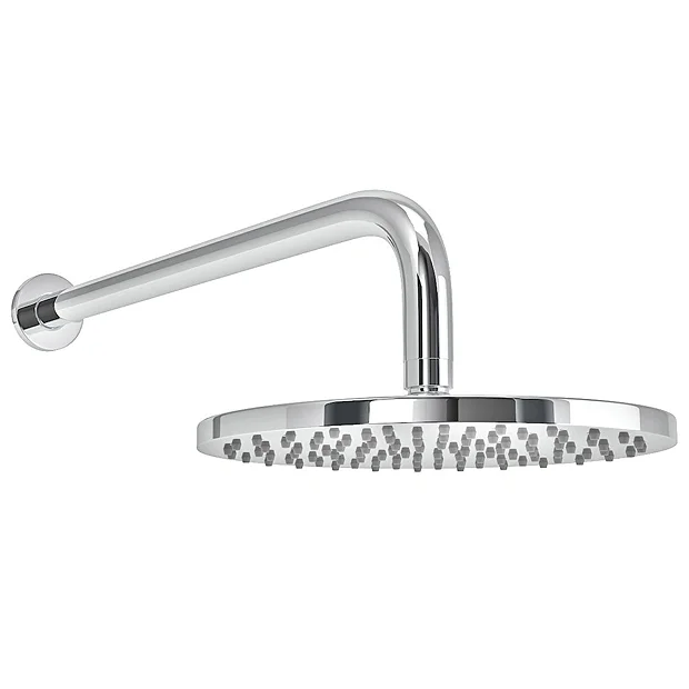 The wall mounted Bosa modern concealed one outlet shower package features minimalist round lever handles with a stylish matching curved back plate in chrome and a 200mm round rainfall type fixed shower head with arm.