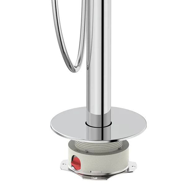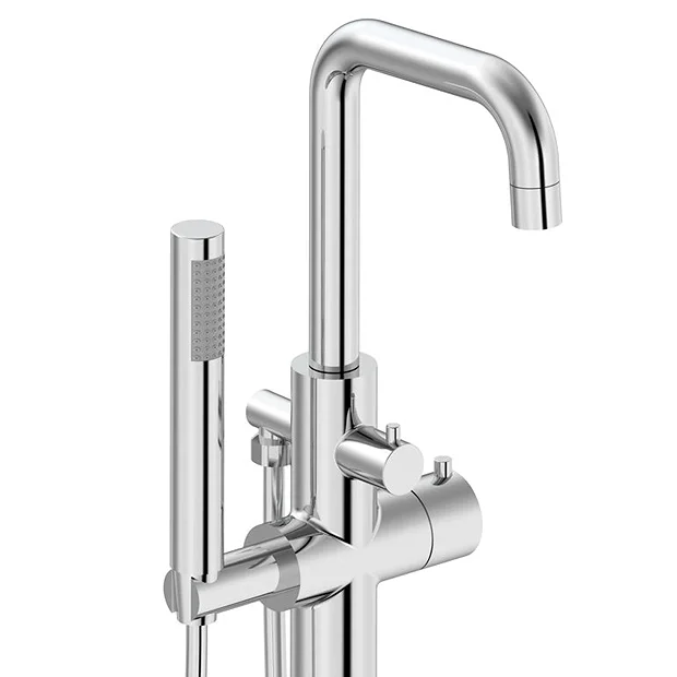 Create an eye-catching statement in your bathroom with the luxury Cruze polished chrome curved thermostatic freestanding bath shower mixer tap. It features a modern elegant design and is complemented by a single round tap head that gives the fingertip control of the temperature and flow of water. Tap has been manufactured from solid brass with a stylish chrome finish and is suitable for system pressures of 1.0 Bar or greater. Tap is supplied with a shower kit consisting of a handheld round pencil shower handset and flexible hose.