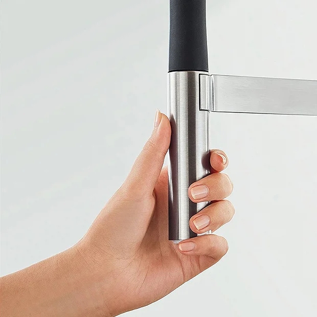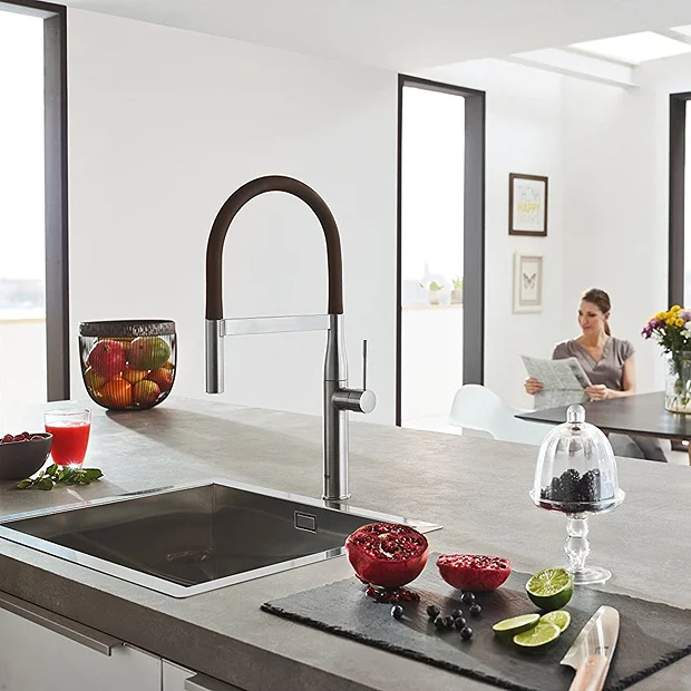 The Essence kitchen sink mixer is a stylish tap with a high swivel spout and features GROHE SilkMove technology for smooth handling of water flow and temperature. The flexible silicone hose makes using the spray head easier while the professional spray features two spray options – a normal spray and a powerful jet spray, ideal for cleaning veg, filling pots and even switching across a double sink. With the GROHE EasyDock M system, the spray head is easily guided back into place by a powerful magnet when you’re done. Manufactured using high grade materials the tap comes in a matt SuperSteel finish. All Grohe kitchen taps come with a 5 year guarantee.