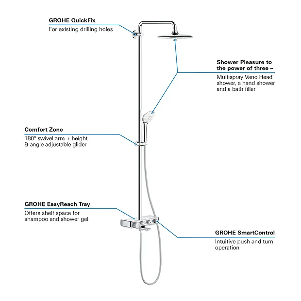 - GROHE QuickFix system means you can install your new shower quickly and easily