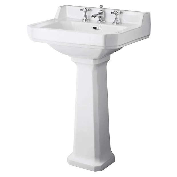 A high-quality traditional 3 tap hole basin with overflow and comfort height pedestal from period bathroom specialists Old London, ideal for creating a period look in your bathroom. Manufactured using high-grade vitreous china ensuring a quality finish and long lasting durability. Bring a touch of elegance and style into your bathroom with the sublime Richmond collection of sanitaryware. Comes with a 5 year guarantee against faulty workmanship or materials.